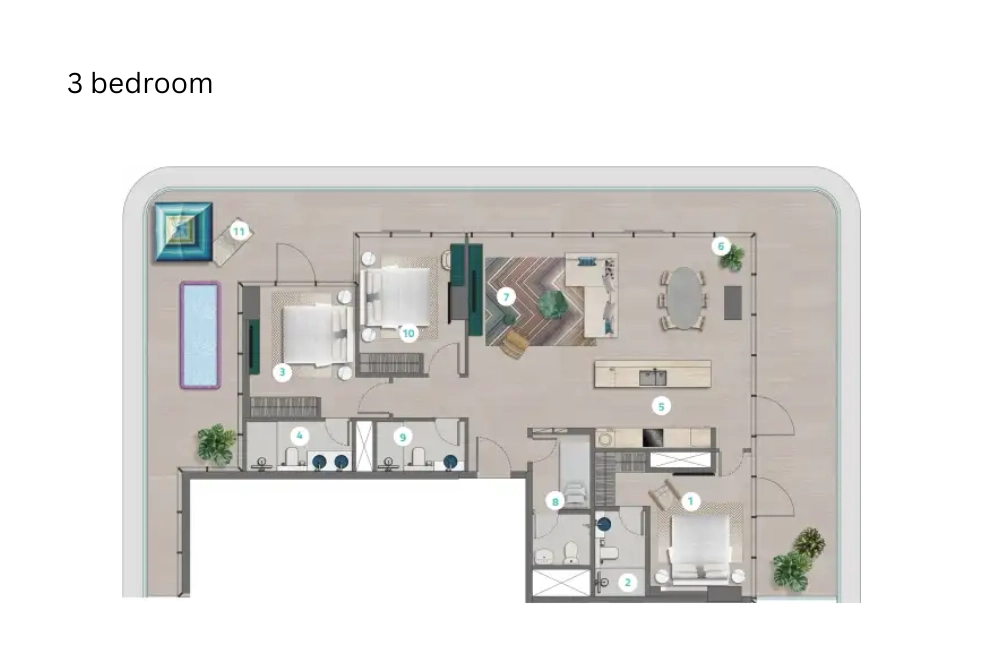 Sited within the stunning Al Marjan Island, Trio Isle masterplan will consist of 1 to 3 bedroom apartments that are accompanied by luxury amenities. The residents will be treated to the TRIO effect—three podium floors, three pools, three restaurants, and three lobbies—that will deliver a resort lifestyle.